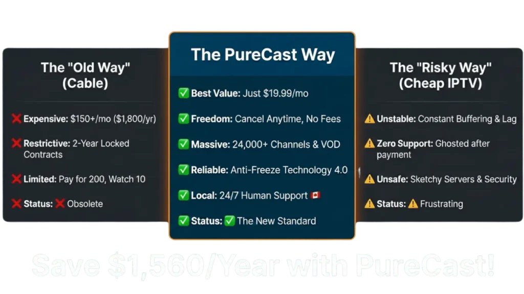Cable companies charge $150/month for channels you don’t watch. Other IPTV providers ghost you after payment. PureCast delivers premium streaming at cable-crushing prices with real support.