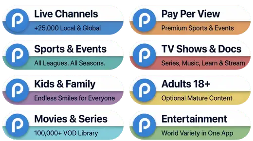Over 25,000 live channels and 100,000+ movies & series in HD, FHD and 4K—always one click away.